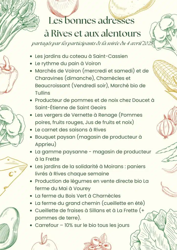 Lors de la soirée-débat du 4 avril 2025 sur le thème « Manger sainement est-ce si facile ? », les participants ont suggéré leurs bonnes adresses, ainsi que les trucs et astuces qu’ils utilisent.