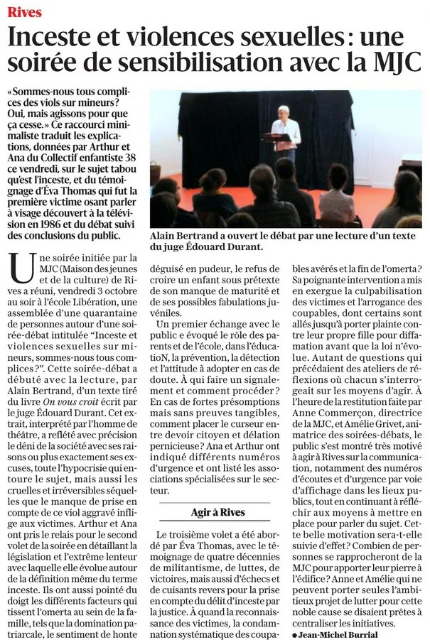 - Venir et/ou diffuser l’information de la manifestation du 15 novembre contre les violences sexuelles faites aux enfants et aux ados à 14h samedi 15 novembre au Jardin de Ville à Grenoble : https://collectifenfantiste.fr/mobilisation-contre-les-violences-faites-aux-enfants-ados/